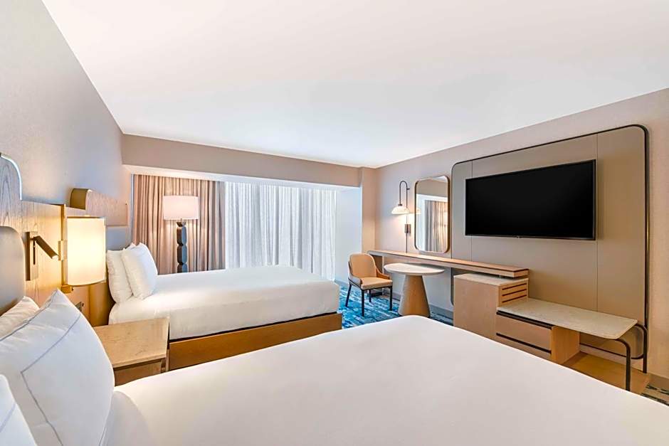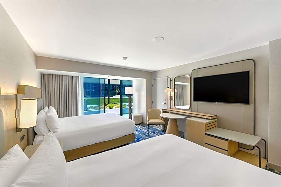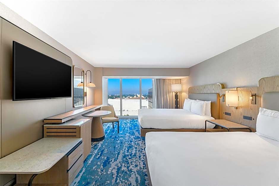This room faces Disneyland and Disney California Adventure parks. A flat-screen TV, refrigerator, gourmet coffee machine, in-room safe and tiled private bathroom are featured.