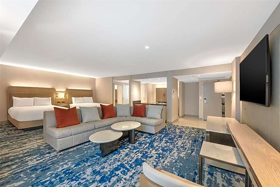 This wheelchair accessible room features a flat-screen TV, refrigerator, gourmet coffee machine, in-room safe and tiled private bathroom.