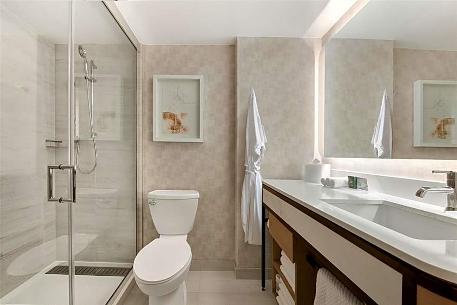 This contemporary room features a flat-screen TV, refrigerator, gourmet coffee machine, in-room safe and tiled private bathroom.