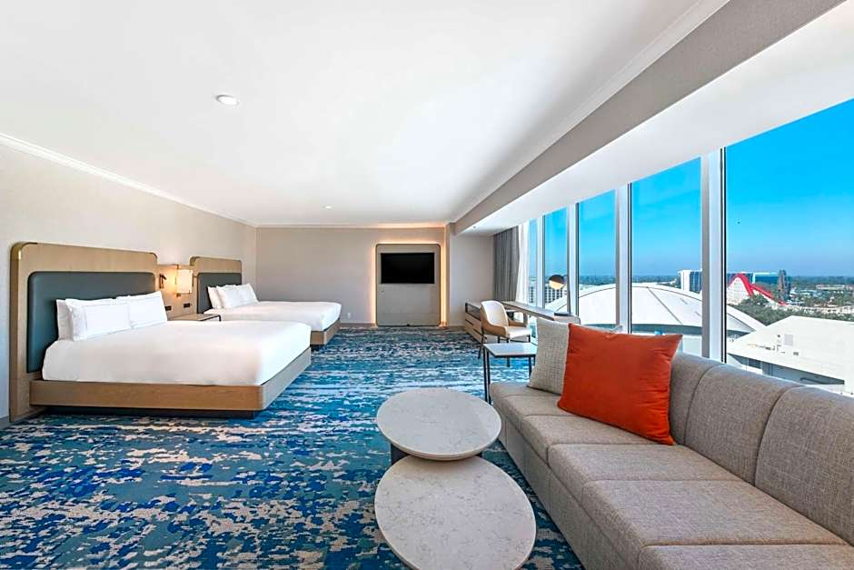 This room faces Disneyland and Disney California Adventure parks. A flat-screen TV, refrigerator, gourmet coffee machine, in-room safe and tiled private bathroom are featured.