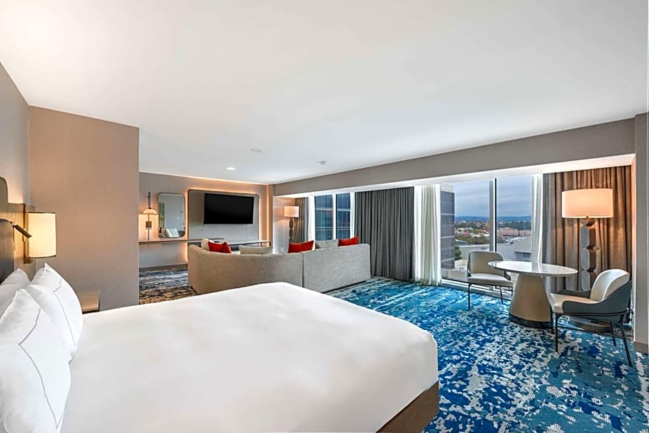 Luxurious pillow-top bedding, a flat-screen HD TV and a digital panel that allows guests to connect and charge several devices at once is provided in this presidential suite. Surrounding the bar area includes a sofa bed.